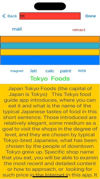 Tokyo food (Japanese capital, Tokyo foods) This Tokyo food guide app shows relatively elegant shops of the level the place where we can eat the typical Japanese foods and foods names of the level. Written by brought up by Tokyo nursing Japanese, those selected by people raised in Tokyo downtown.You could find details on the internet in this app if you look for the name of the specific shop you want to eat, how to approach, prices, the latest and detailed contents.This is not a general guide application that contains images and maps of famous shops but aims to show you where to eat and what to eat. When you are staying in Tokyo, if you draw kanji of Japanese explanation in tis App and show it to the Japanese near by, they will be very easy to understand you and will give you an explanation about your question. The most people living in Tokyo will do for you.