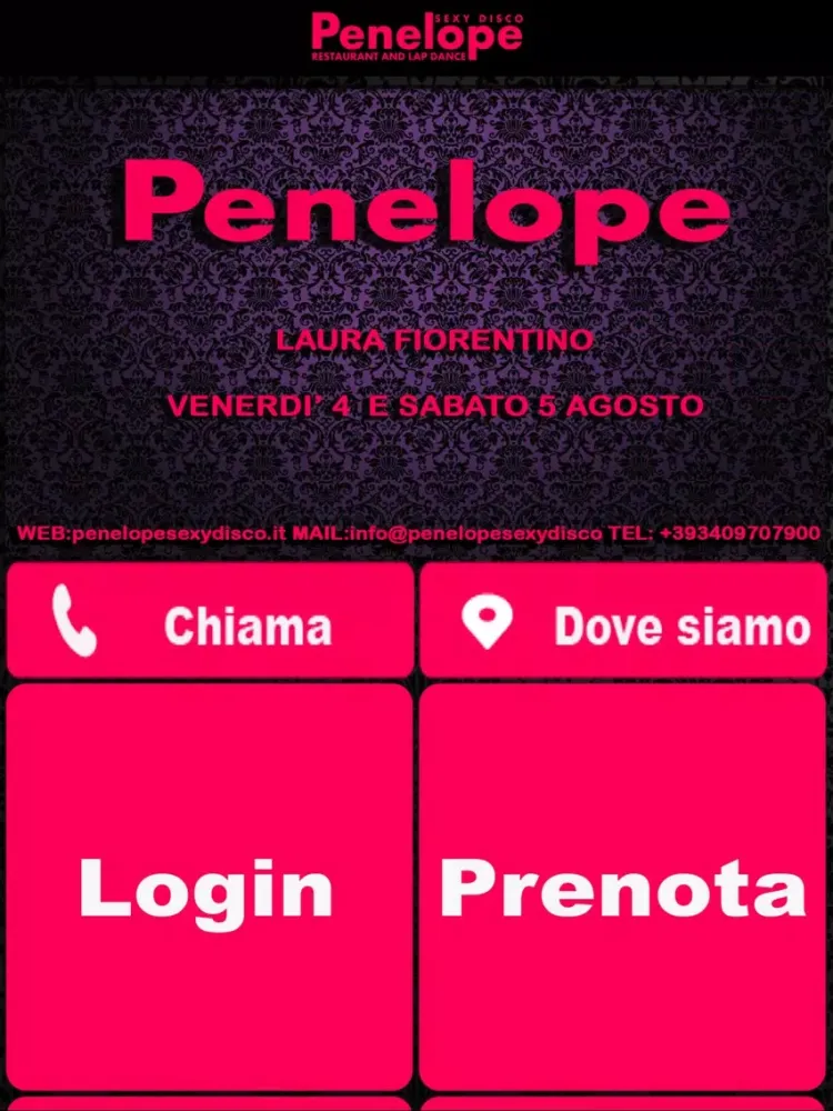 Il Sexy Disco Penelope nasce nel 2010 ed é diventato in poco tempo un locale di culto per gli appassionati di lap-dance e di spettacoli erotici di tutta la Toscana e non solo. E questo grazie all’ambiente elegante, discreto, mai volgare e allo staff simpatico, sempre pronto a coccolare i suoi clienti. Pensato sia per un pubblico maschile che femminile conta, infatti, su un selezionatissimo team di ballerine e strepman ed è perfetto per cene aziendali, cene erotiche, compleanni, feste di addio al celibato e al nubilato. Il Penelope ha al suo interno un ottimo ristorante che offre pietanze prelibate, fiumi di vino e champagne a prezzi popolari: in più gli ospiti del club saranno serviti dalle sexy cameriere e, tra una portata e l’altra, potranno assistere agli spettacoli erotici, accompagnati dalla migliore musica happy house. Dopo cena poi show in privato.