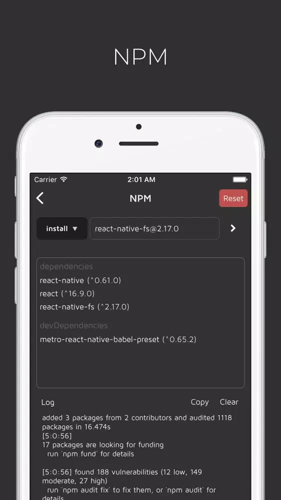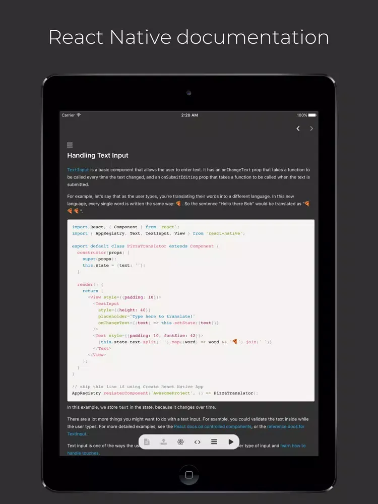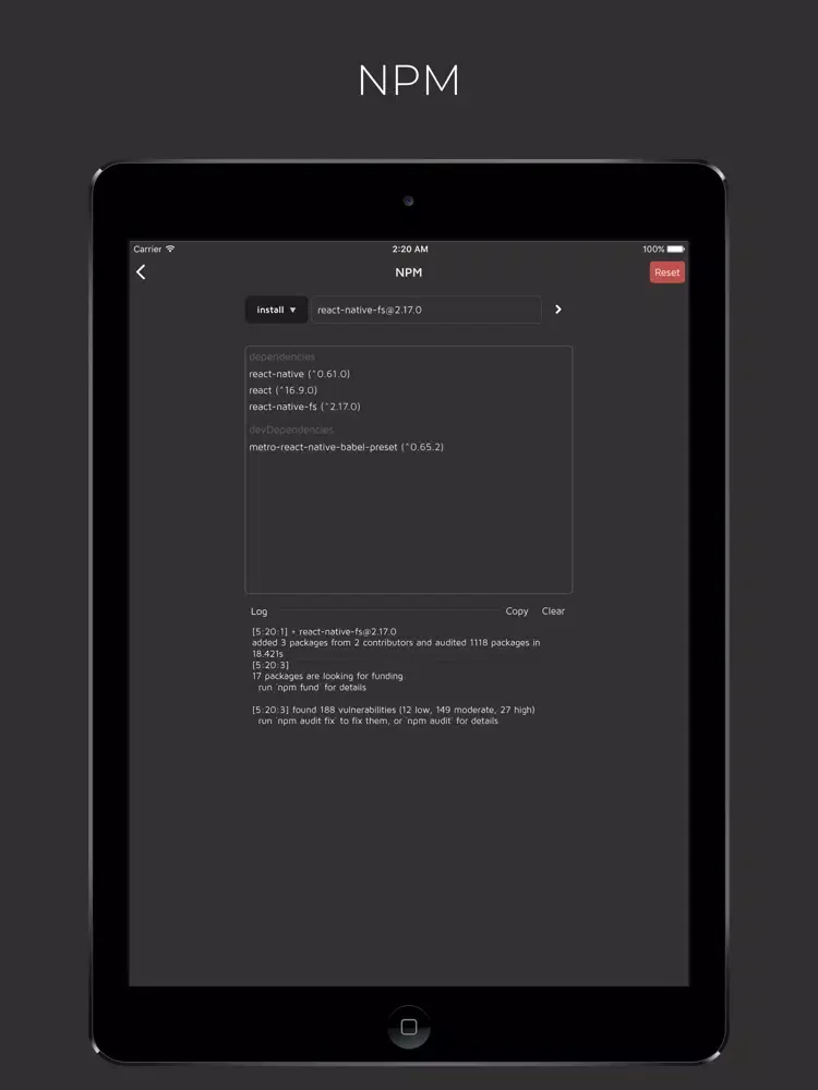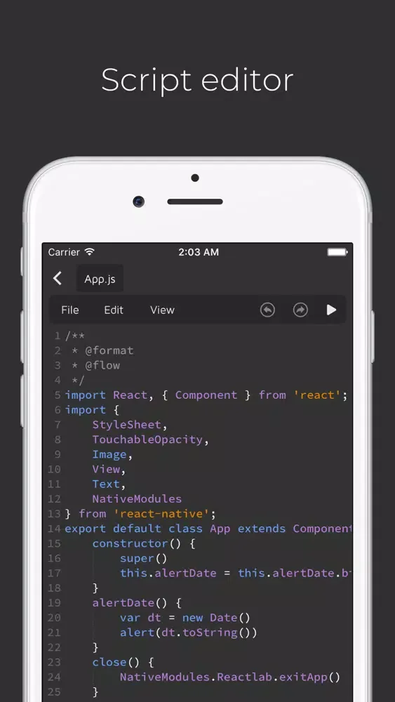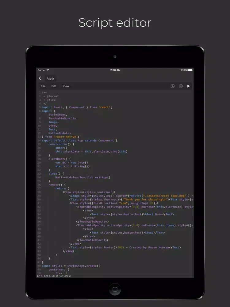 Test and debug your JavaScript files on the fly with React Native library without internet connection.