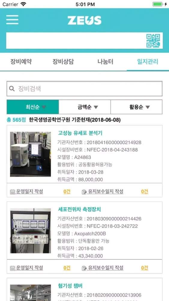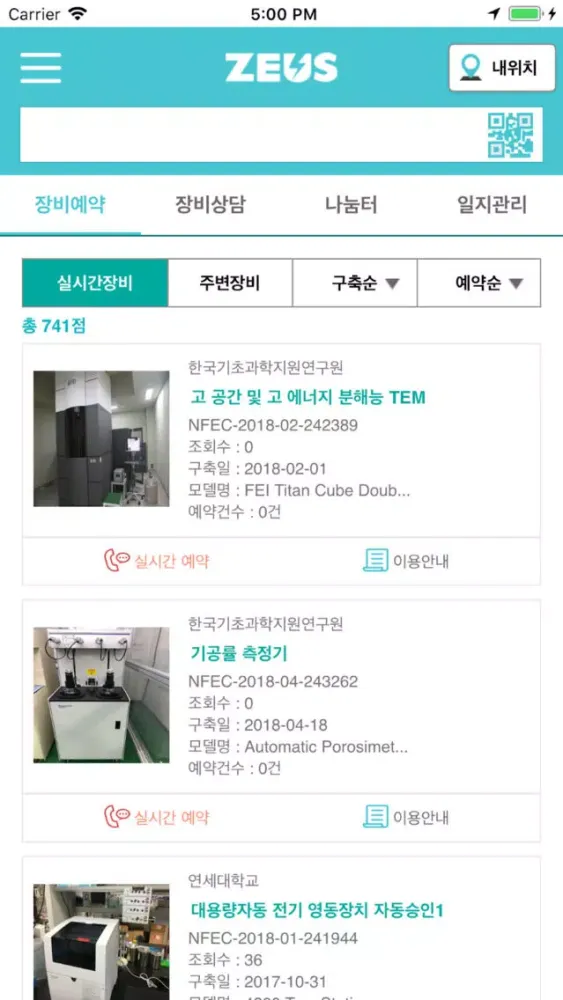 ZEUS(Zone for Equipment Utilization Service) 장비활용종합포털 모바일앱은 50,000여점의 공동활용 가능한 국가연구시설장비의 활용 극대화를 위하여 필요한 정보와 서비스를 제공하는 국내 최고의 장비활용종합지원포털인 ZEUS(http://www.zeus.go.kr)의 핵심적인 기능을 제공하는 모바일 앱입니다.