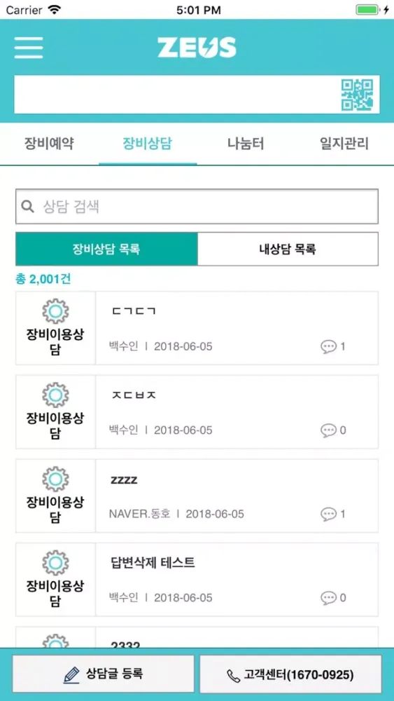 장비상담 : 장비이용문의, 실태조사문의, 장비이전문의, 고객센터 온라인 상담