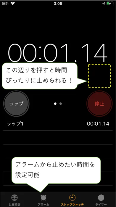 ・ストップウォッチを開始した後、停止ボタンの上側をタップするとあなたが設定した時間でストップします。
