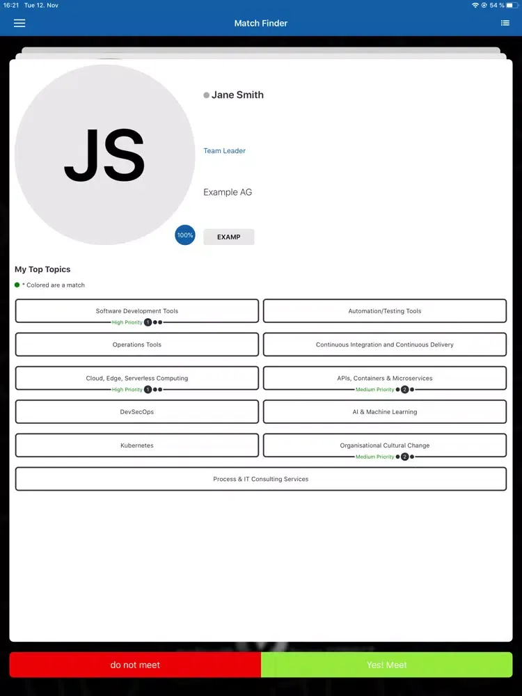 Our matchmaking- and event app helps you to make valuable connections at your chosen event, saves you time and effort by using advanced algorithms to recommend the right people and presents them in an intuitive interface that you will love.