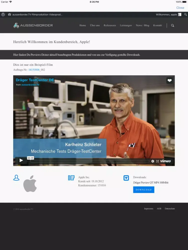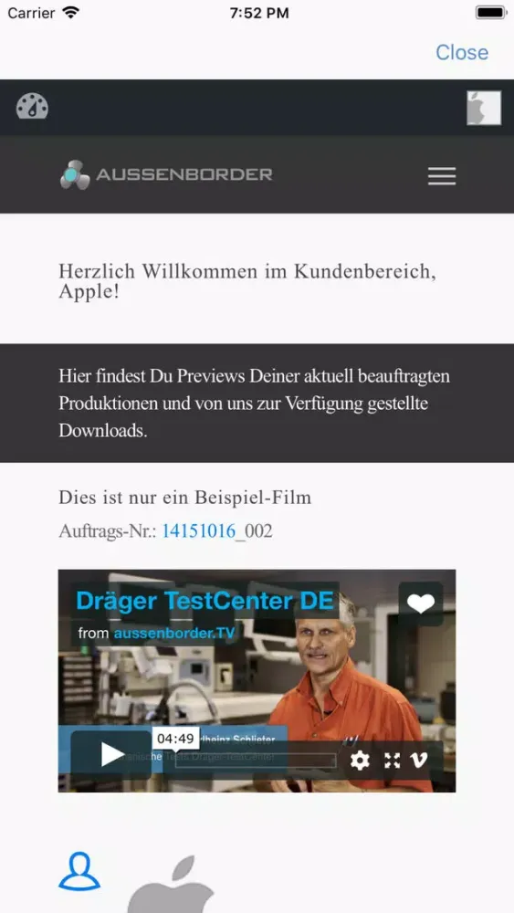 Diese App erlaubt Nutzern sich in ihren Kundenaccount bei der Filmproduktion Aussenborder aus Hamburg einzuloggen um einfachen Zugang zu ihren Kunden-Previews zu erhalten.