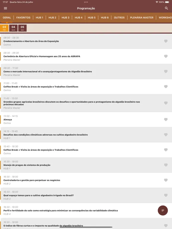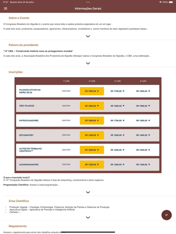 No aplicativo do 14º Congresso do Algodão você encontra tudo o que precisa saber sobre o evento, assim como a programação completa atualizada em tempo real, todo o conteúdo em uma biblioteca exclusiva, os slides dos palestrantes, trabalhos e muito mais.