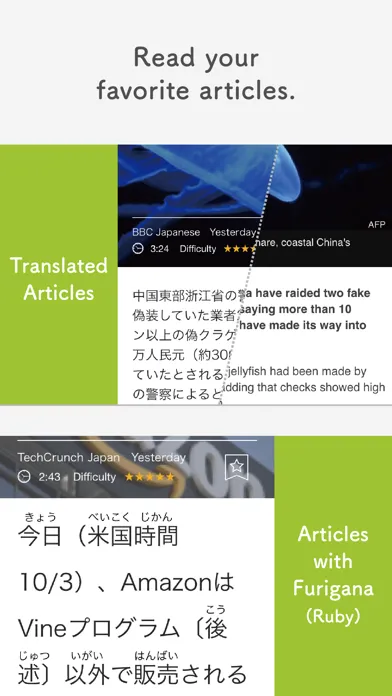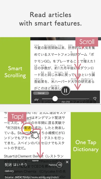 - Smart Scrolling: Articles can scroll automatically at your desired reading speed, to help improve your natural Japanese reading comprehension.