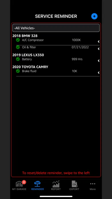 -View/add/update/delete maintenance items for multiple vehicles (oil change, brake, tire, battery, etc.)