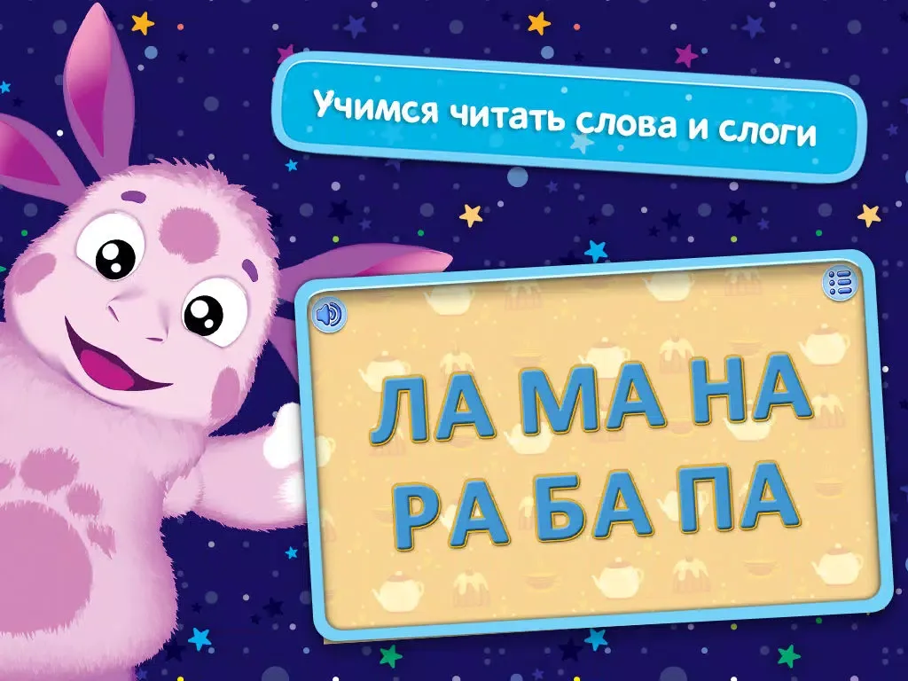 Приложение «Лунтик. Учимся читать!» рассчитано на детей от 1 до 7 лет. С помощью этого приложения ребенок научится читать с нуля, даже если он еще не знает букв.